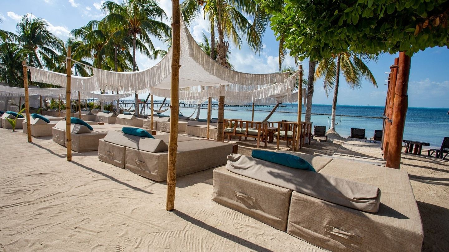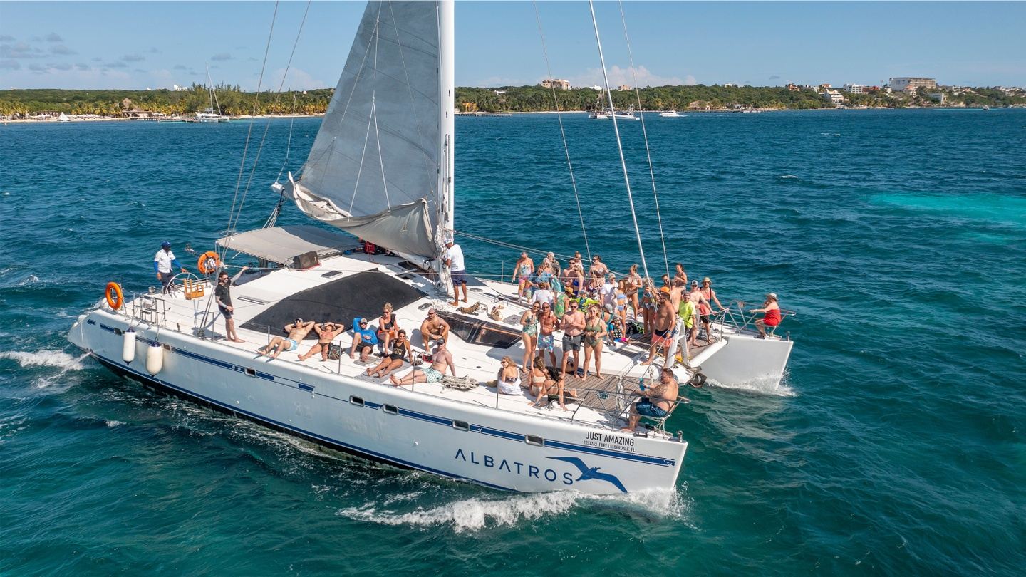 Step off the catamaran and onto warm, powder-soft sand as turquoise water laps gently at the shore. A chilled drink is placed in your hand before you’ve even chosen your spot—loungers shaded by swaying palms, or a sun-soaked seat right at the water’s edge.